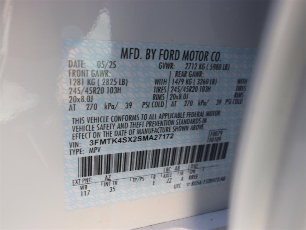 1st & 2nd Row Floor Liners w/o Carpet Mats, Cargo Area Cover, Cargo Floor Liner, Equipment Group 400A Standard Package, Interior Protection Package, Mobile Power Cord (120V/240V), Mustang Mach-E GT Performance Upgrade, Panoramic Fixed-Glass Roof, Wheels: 20" Machined Face Aluminum.