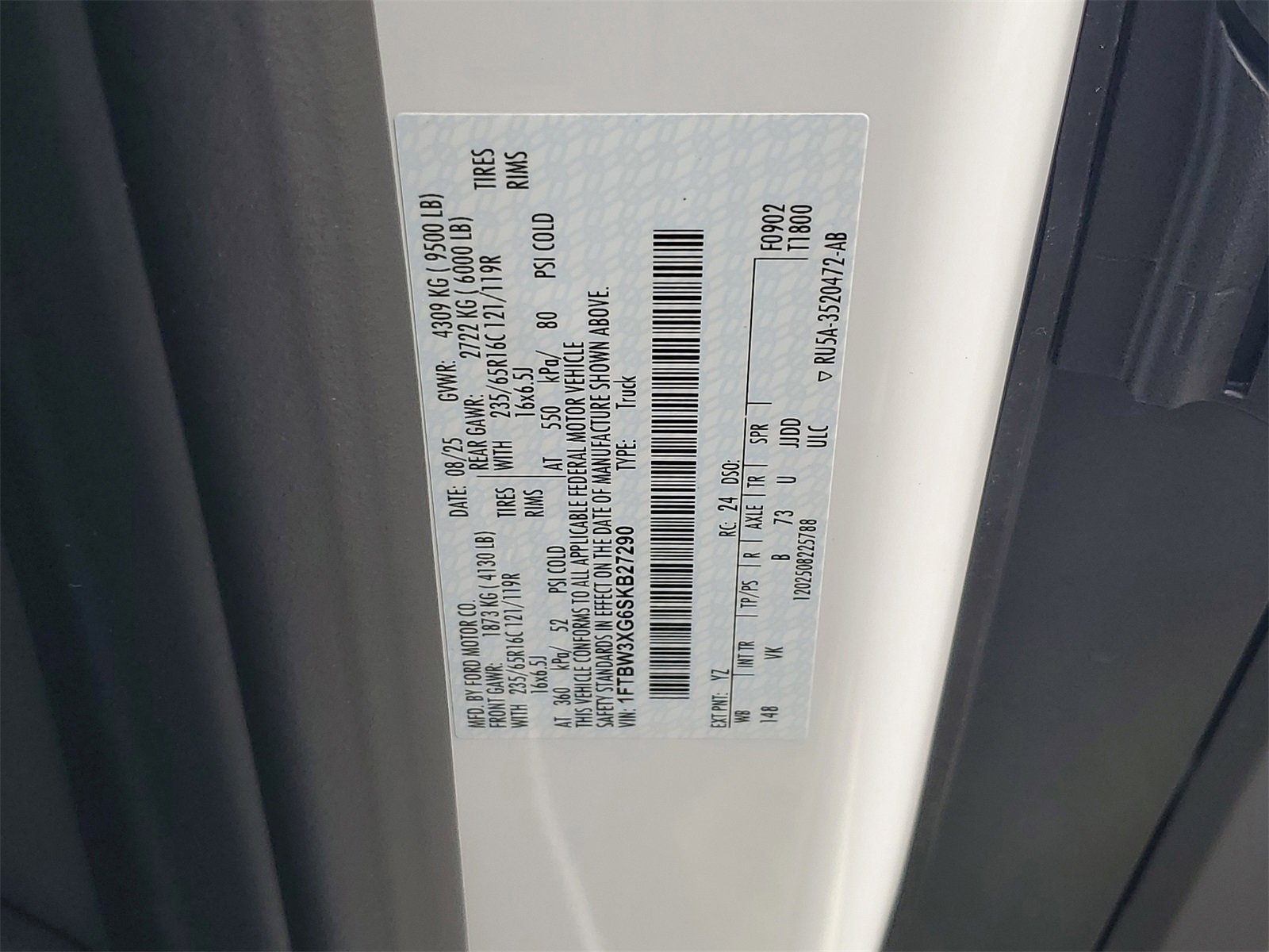 • VIN # 1FTBW3XG6SKB27290