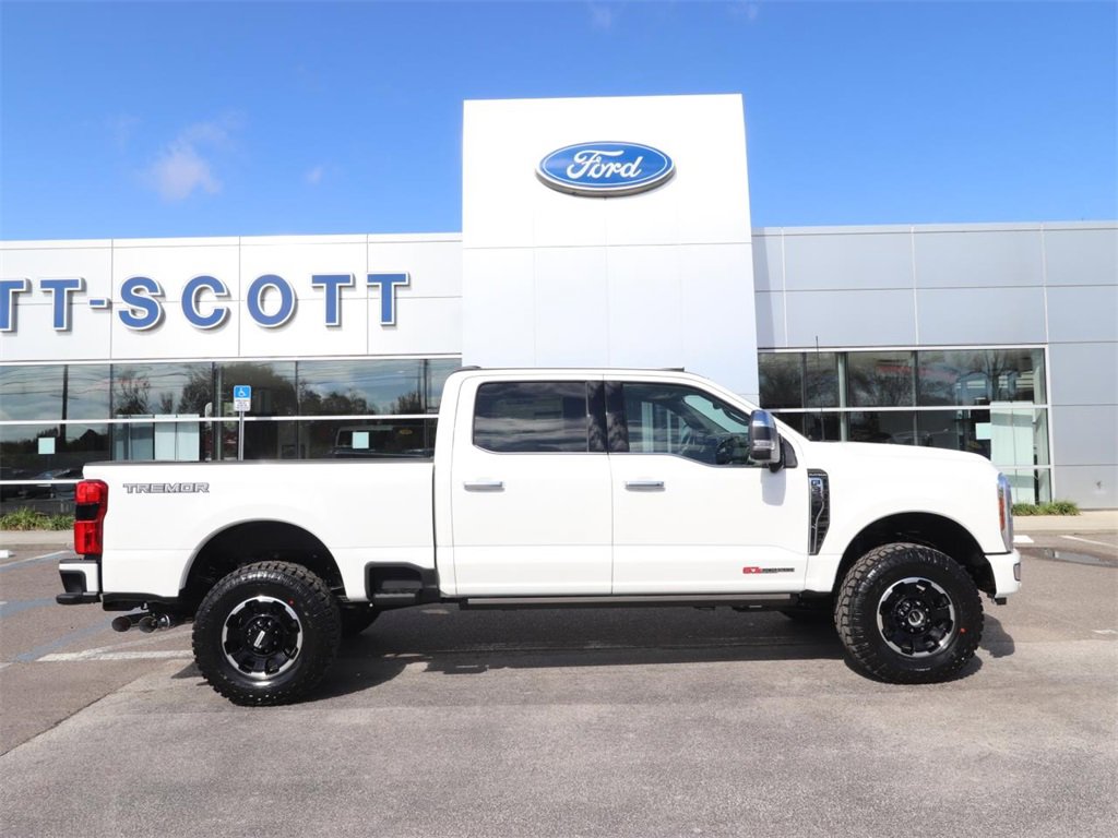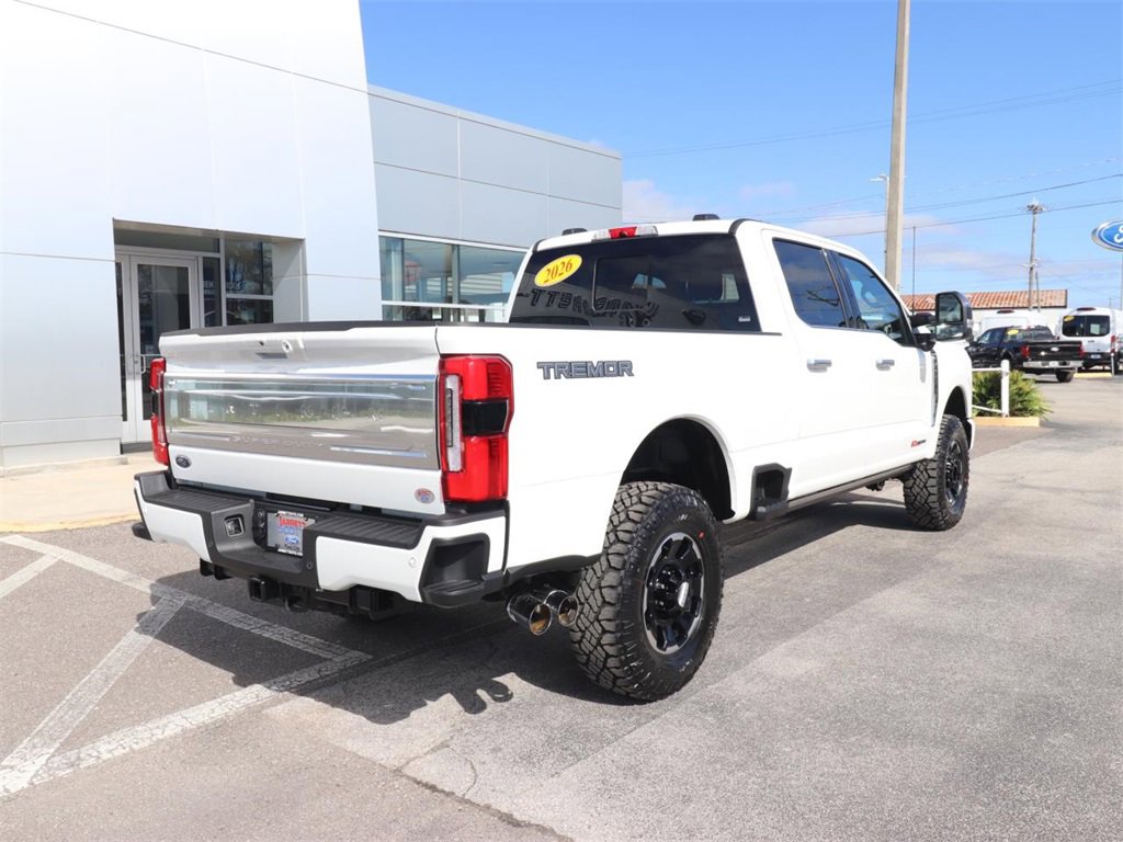 4WD, 5th Wheel/Gooseneck Hitch Prep Package, ABS brakes, Alloy wheels, Compass, Electronic Stability Control, Electronic-Locking with 3.73 Axle Ratio, Engine Block Heater, Flow-Through Console, Ford Connectivity Package (one-Time Purchase - 7 Years), Front dual zone A/C, Heated door mirrors, Heated front seats, Heated rear seats, Illuminated entry, Illuminated Scuff Plates, Low tire pressure warning, Order Code 713A, Platinum Plus Package, Premium Leather Instrument Panel Topper, Premium Luxury Leather-Wrapped Steering Wheel, Premium Venetian Leather Door Panel, Pro Power Onboard - 2kW, Radio: B&O Unleashed Sound System by Bang & Olufsen, Remote keyless entry, Satin Chrome Door Handles, SecuriCode Keyless Entry Keypad (driver's Side), SiriusXM with 360L, SYNC 4 with Enhanced Voice Recognition, Textured Matte Finish Off-Road Running Boards, Tough Bed Spray-in Bedliner, Traction control, Tremor Off-Road Decal, Tremor Off-Road Package, Twin Panel Power Moonroof, Unique Platinum Leather 40/Console/40 Seats, Unique Platinum Plus Luxury Leather 40/Console/40 Seats, Unique Satin Finish Grille, Unique Split Center Console Armrest, Upfitter Switches (6), Wheels: 18" Ebony Black Machined and Painted Aluminum, Wheels: 20" Bright Machined Aluminum, Wheels: 20" Bright Machined and Painted Aluminum.