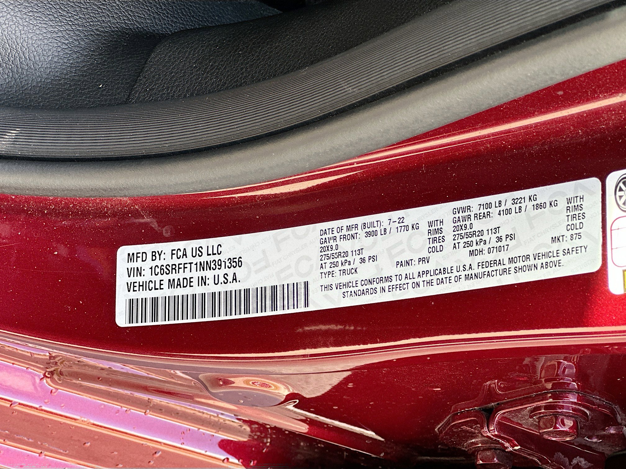 • VIN # 1C6SRFFT1NN391356