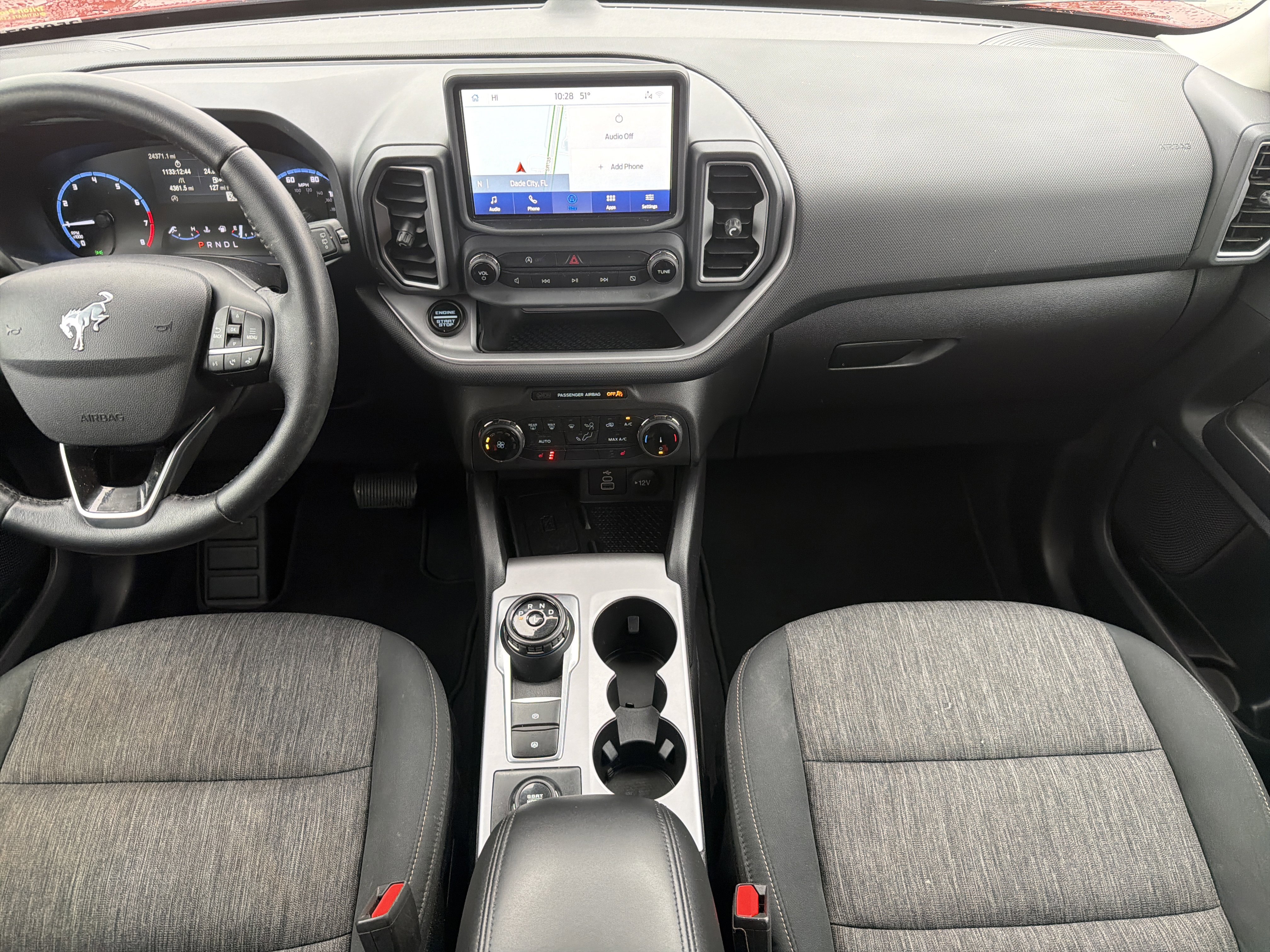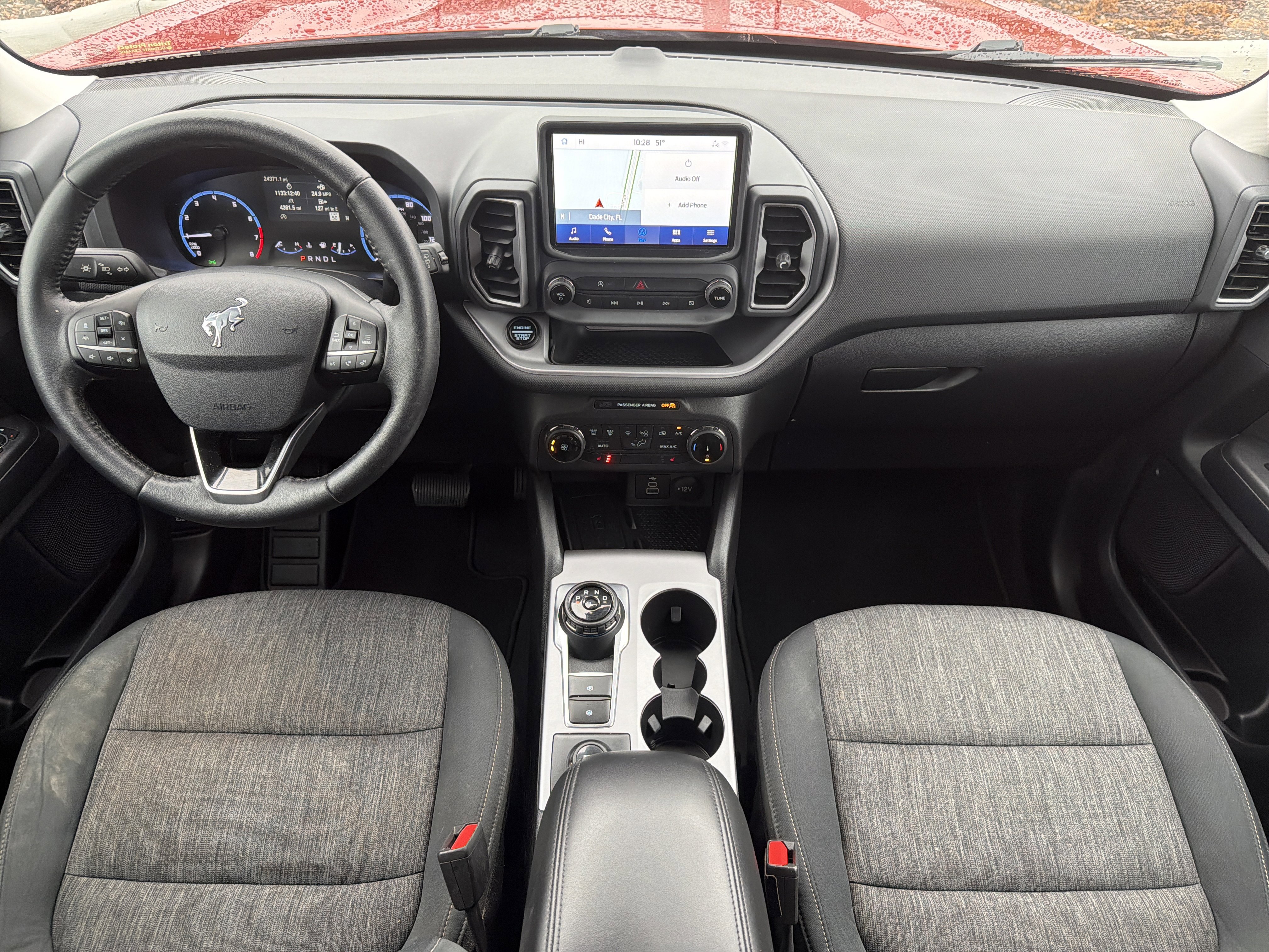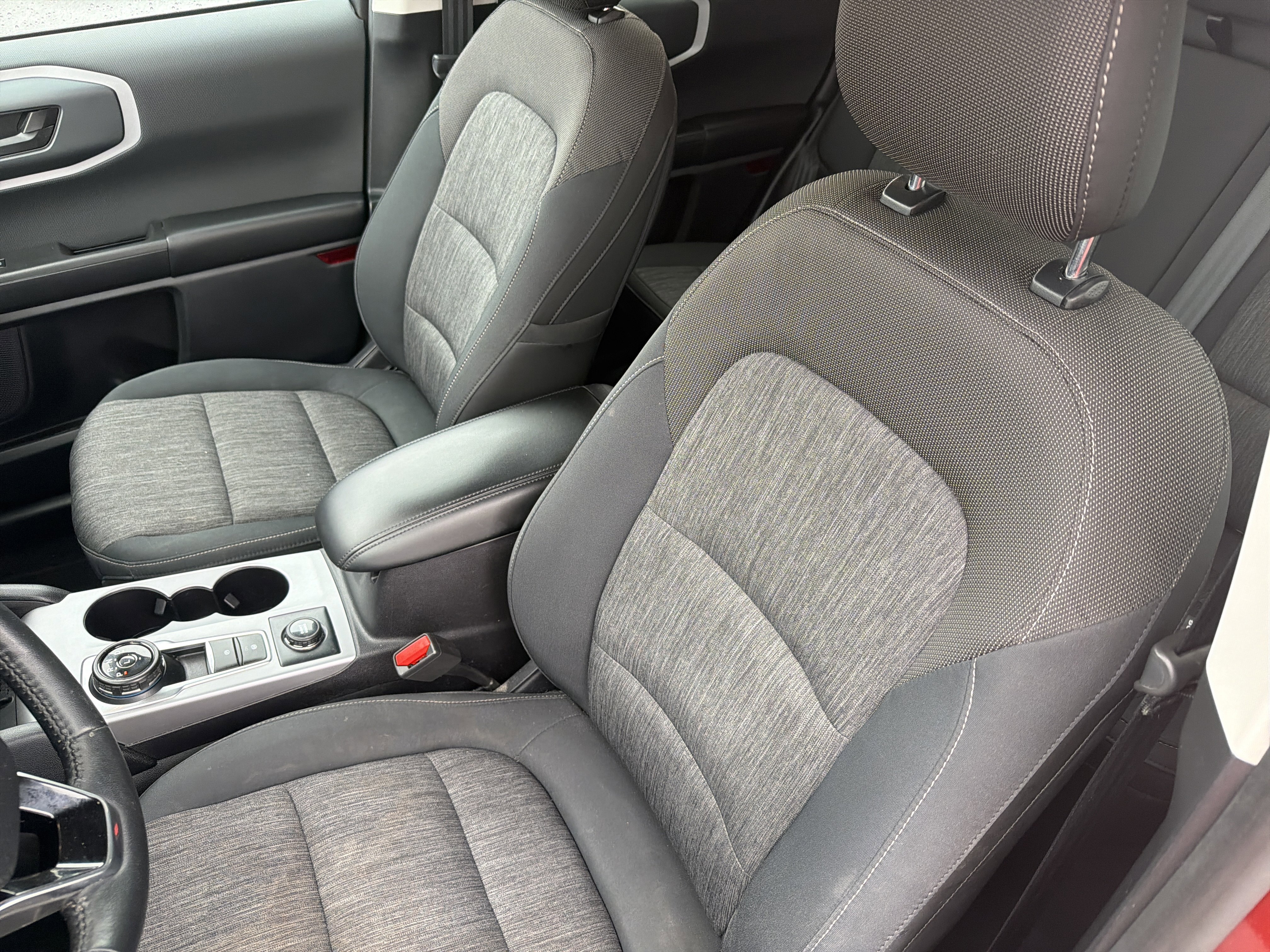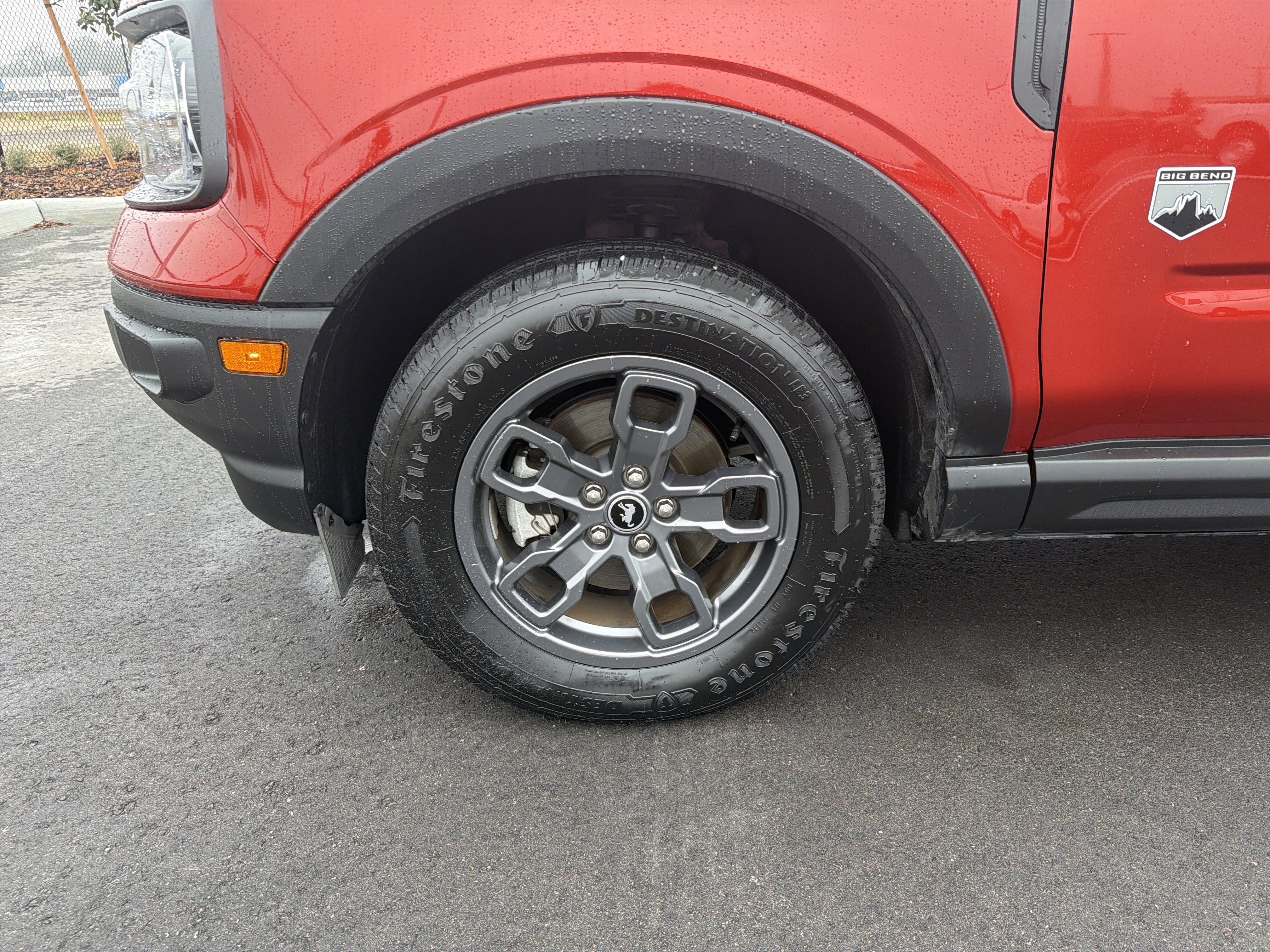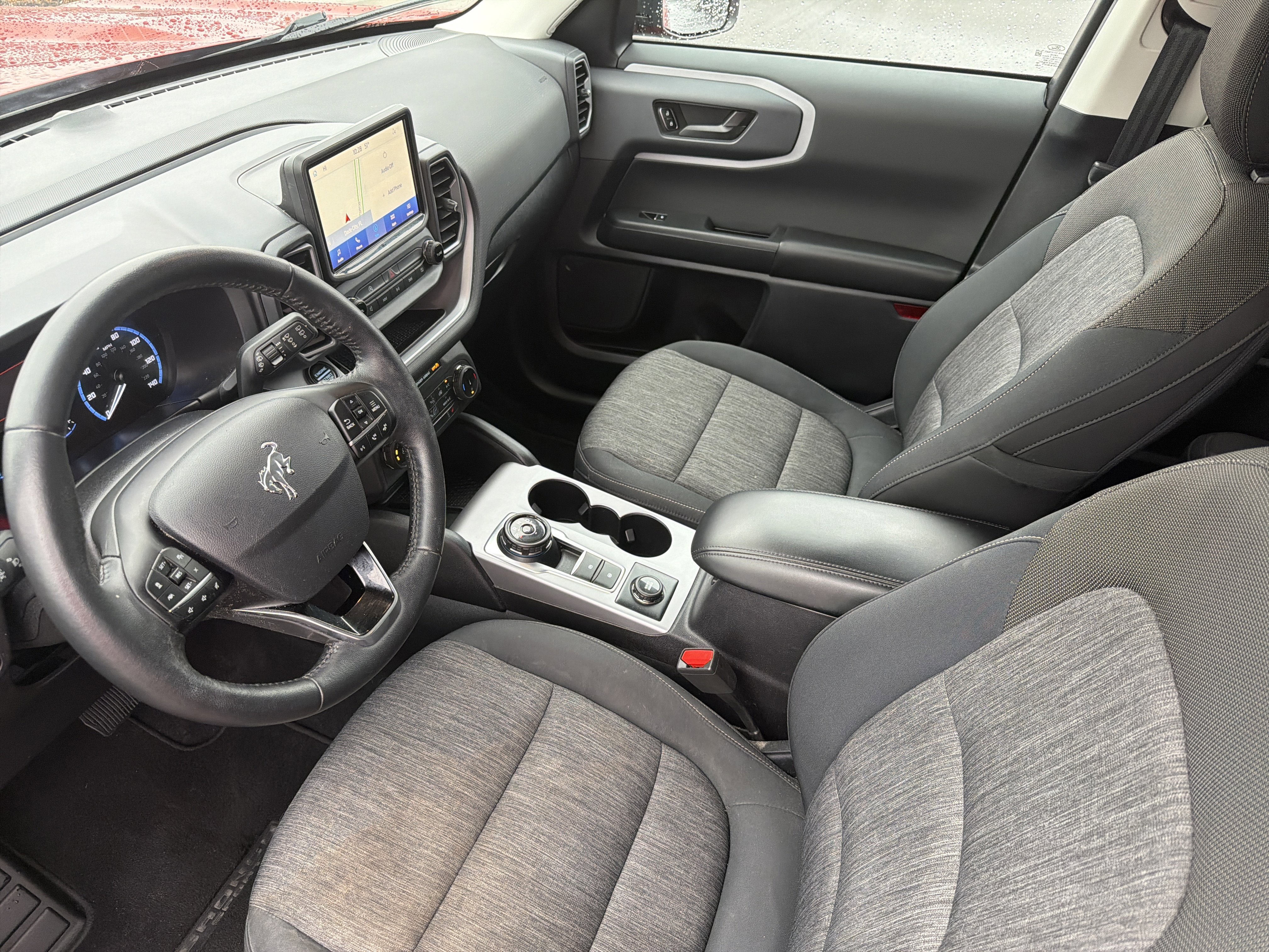 Hot Pepper Red Tinted Clearcoat 2023 Ford Bronco Sport Big Bend 4WD 8-Speed Automatic 1.5L EcoBoost 3.80 Axle Ratio, 4-Wheel Disc Brakes, 4G LTE Wi-Fi Hotspot Credit, 6 Speakers, ABS brakes, Air Conditioning, AM/FM radio: SiriusXM, AM/FM Stereo, Auto High-beam Headlights, Automatic temperature control, Brake assist, Compass, Convenience Package, Delay-off headlights, Driver door bin, Driver vanity mirror, Dual front impact airbags, Dual front side impact airbags, Electronic Stability Control, Emergency communication system: SYNC 3 911 Assist, Equipment Group 200A, Evasive Steering Assist, Ford Co-Pilot360 Assist+, Four wheel independent suspension, Front anti-roll bar, Front Bucket Seats, Front Center Armrest, Front Driver & Passenger Seatback Zipper Pockets, Front reading lights, Fully automatic headlights, Heated door mirrors, Heated Front Bucket Seats, Illuminated entry, Intelligent Access (Lock/Unlock), Intelligent Adaptive Cruise Control w/Stop & Go, Knee airbag, Leather-Wrapped Steering Wheel, LED Fog Lamps, Low tire pressure warning, Occupant sensing airbag, Outside temperature display, Overhead airbag, Overhead console, Panic alarm, Passenger door bin, Passenger vanity mirror, Power door mirrors, Power Moonroof, Power steering, Power windows, Radio data system, Rear anti-roll bar, Rear Parking Sensors, Rear reading lights, Rear seat center armrest, Rear window defroster, Rear window wiper, Remote keyless entry, Security system, SiriusXM, Speed control, Speed-sensing steering, Speed-Sensitive Wipers, Split folding rear seat, Steering wheel mounted audio controls, SYNC 3 Communications & Entertainment System, SYNC 3/Apple CarPlay/Android Auto, Tachometer, Telescoping steering wheel, Tilt steering wheel, Traction control, Trip computer, Unique Cloth Front Bucket Seats, Universal Garage Door Opener (UGDO), Variably intermittent wipers, Voice-Activated Touchscreen Navigation System, Wheels: 17 Carbonized Gray-Painted Aluminum, Wireless Charging Pad.